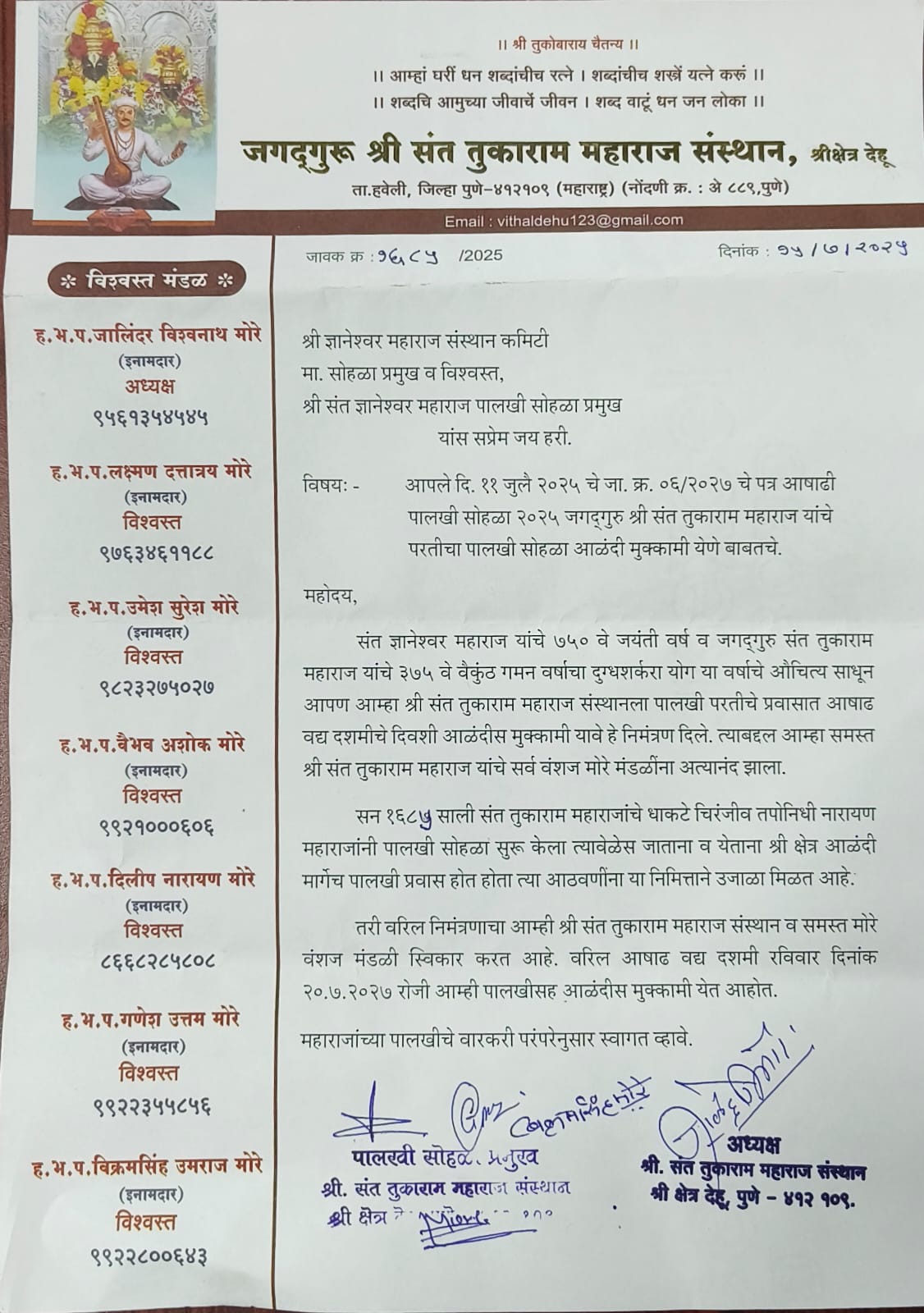 याबाबतची अधिक माहिती आळंदी देवस्थानचे व्यवस्थापक ज्ञानेश्वर वीर यांनी दिली. ते म्हणाले, संत ज्ञानेश्वर महाराज यांचे ७५० वे जयंती वर्ष व जगद्‌गुरु संत तुकाराम महाराज यांचे ३७५ वे वैकुंठ गमन वर्षाचा दुग्धशर्करा योग या वर्षाचे औचित्य साधून आळंदी देवस्थाने श्री संत तुकाराम महाराज संस्थानला पालखी परतीचे प्रवासात आषाढ वद्य दशमीचे दिवशी आळंदीस मुक्कामी यावे हे निमंत्रण दिले. हे निमंत्रण देहू संस्थांनने स्वीकारले आहे. यंदा संत तुकाराम महाराजांची पालखी सोहळा देहूत परतण्यापूर्वी रविवारी(दि.२०) रोजी श्री क्षेत्र आळंदीत मुक्कामी येणार आहे.संत ज्ञानेश्वर महाराज संस्थान कमिटीने दिलेले आमंत्रण जगतगुरु तुकाराम महाराज संस्थानने स्वीकारले असून,आळंदी मुक्कामी येण्याचे कळविले आहे.